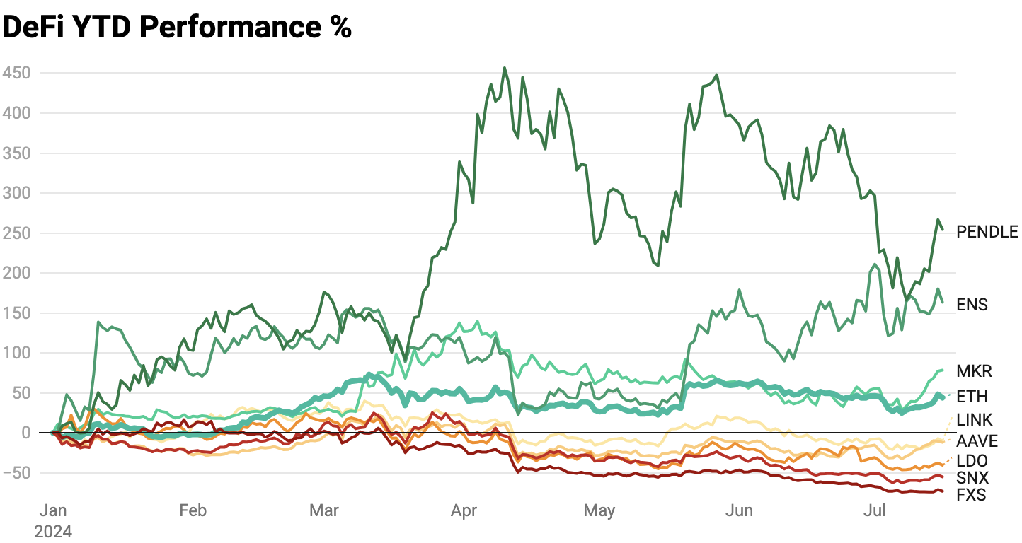 在这个篮子中的 8 个 DeFi 代币中,有 3 个跑赢了 ETH,分别是 PENDLE(+254%)、ENS(+163%)和 MKR(+78%)。其余 5 个今年都下跌,表现最差的是 FXS,下跌了 73%。