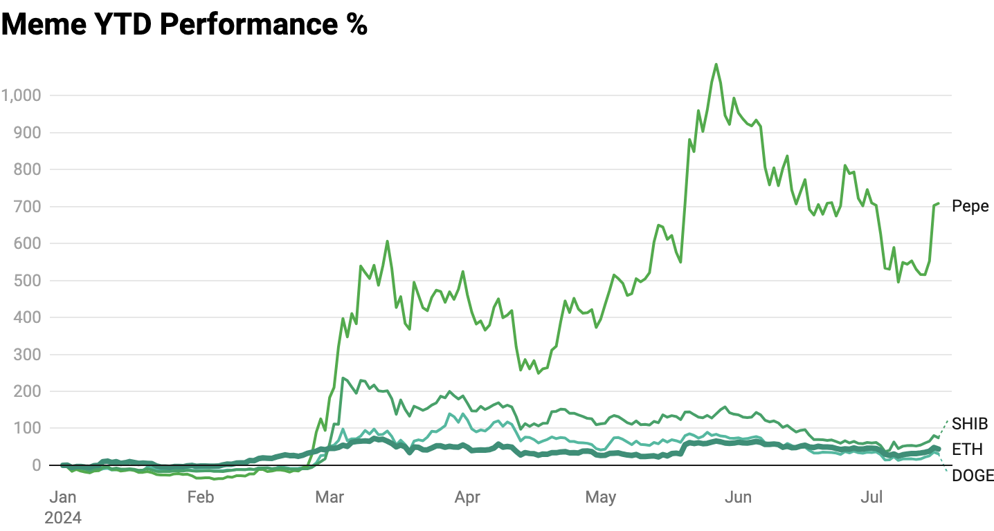 2024 年,meme 代币表现突出,这在最大的以太坊原生 meme 代币中尤为明显。Pepe 涨幅最大,上涨了 708%;SHIB 上涨 74%;DOGE 上涨 31%。