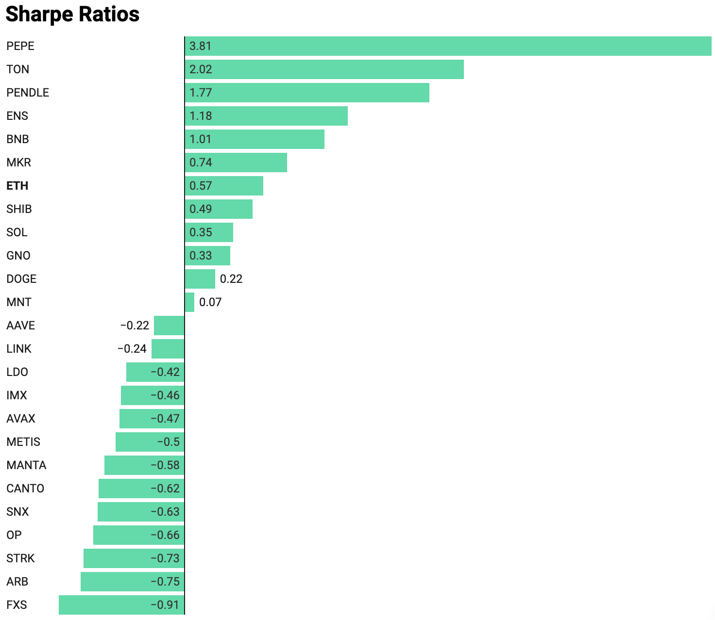 最后,我们可以计算这些资产的年初至今 Sharpe 比率,以衡量其近期表现。Sharpe 比率通过将回报减去无风险利率,再除以波动性(标准差)来衡量波动性调整后的回报。用于此分析的无风险利率是 Maker 的“DAI 储蓄利率”所提供的 8% 年收益率。Sharpe 比率越高,表现越好。