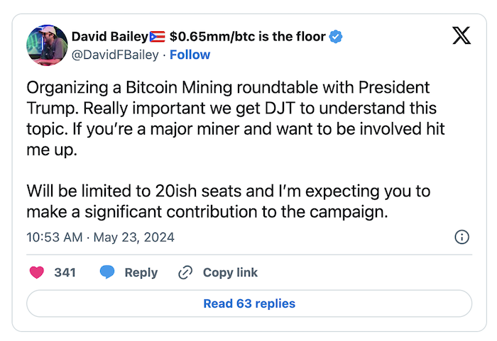 David Bailey:正在组织一场与特朗普总统的比特币挖矿圆桌会议。非常重要的是让特朗普了解这个话题。如果你是主要的矿工并且希望参与,请联系我。会议席位将限制在20个左右,我希望你能对竞选活动做出重大贡献。
