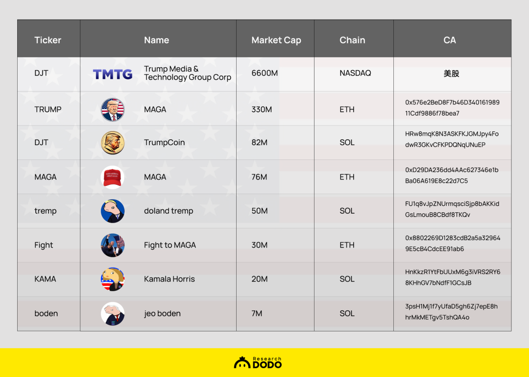 笔者在此罗列中市值较大,社群共识较强的 7 个迷因币,并列出由美国前总统特朗普当任总裁目前在美股那斯达克交易所的 Trump Media & Technology Group 股票 $DJT 作为对照组,对照加密领域的政治迷因币的市值。