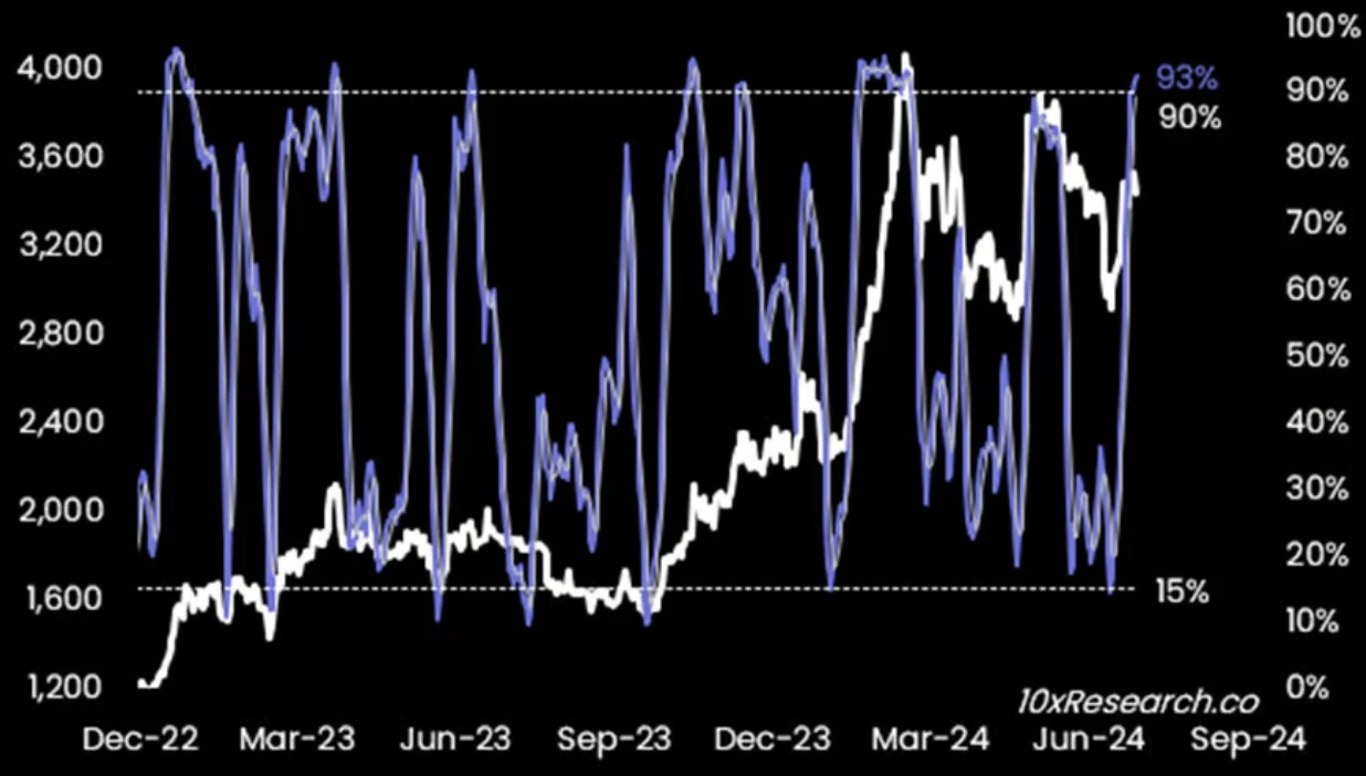 注:以太坊随机指标(Stochastics indicator,大于 90% 意味着超买)。