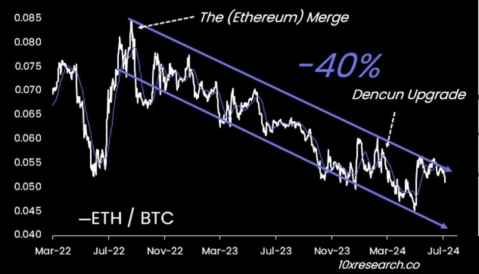与 BTC 相比,ETH 上涨的 β 系数也在减弱。自这轮牛市开始以来,ETH 表现就一直不够理想,如果从 2022 年 10 月开始算起,ETH 的表现要落后 BTC 40% 。