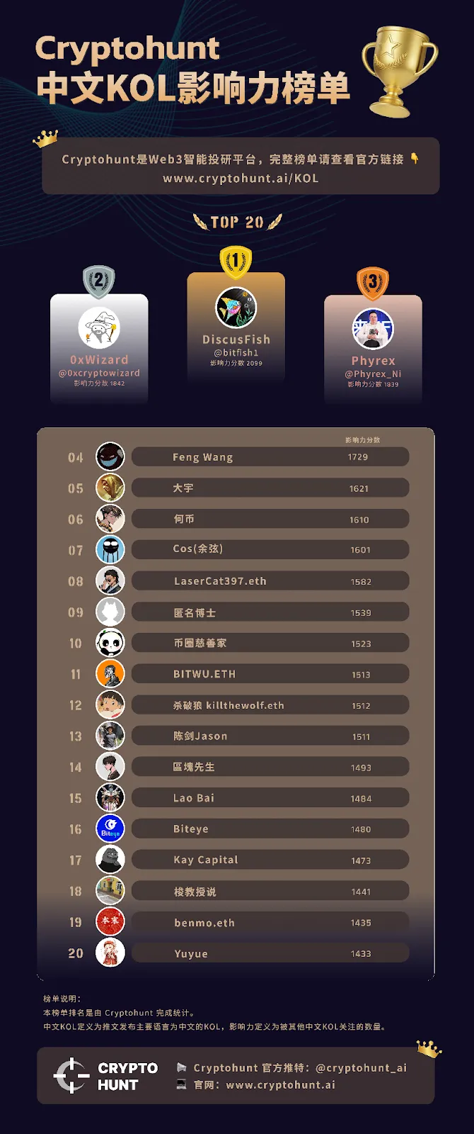 Web3智能投研平台公布了中文KOL影响力榜单,综合评估了KOL的影响力并进行排序。