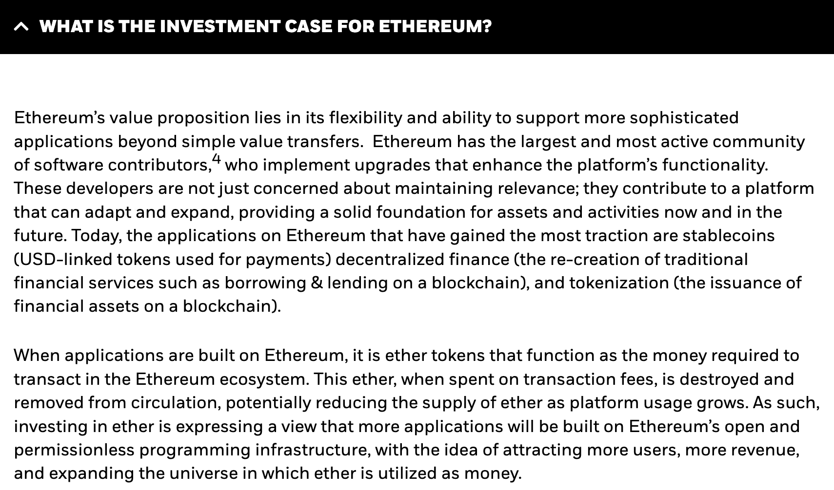 当应用运行在以太坊上时,ether 代币则作为在以太坊生态系统中进行交易所需的货币。这些 ether 在支付交易费用时被消耗并从流通中移除,可能会随着平台使用量的增长而减少 ether 的供应。因此,投资 ether 表达了一种观点,即将有更多应用建立在以太坊的开放和无许可编程基础设施上,目的是吸引更多用户和收入,并扩展 ether 作为货币使用的领域。
