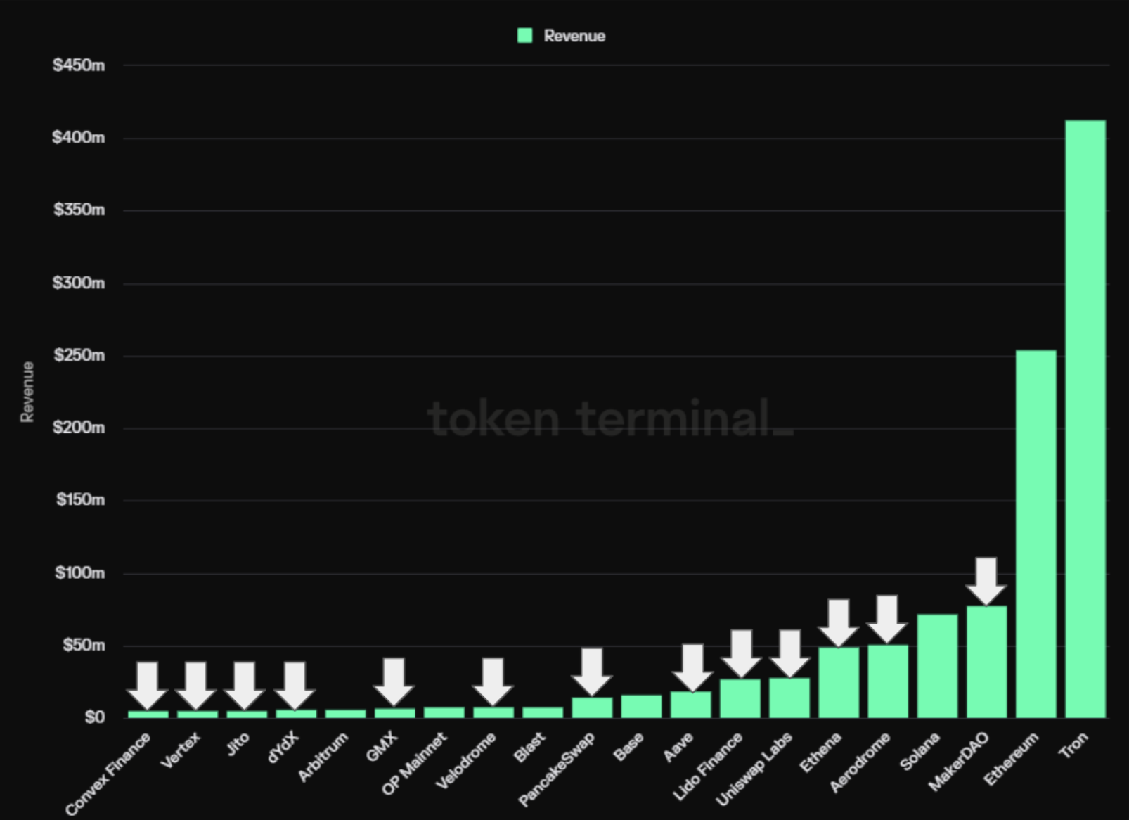 DeFi 作为一个领域也吸引了希望看到收入的基本面驱动投资者。在按收入排名的前 20 个加密项目中,DeFi 占据了 13 个名额,仅次于 L1 和 L2。