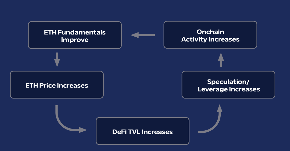 通过 ETH ETF 的机构资本流入可能会导致区块链活动的复苏,这得益于以太坊的经济效应及其生态系统中杠杆的内在作用。然而,值得注意的是,ETH ETF 的被动买家不会像 BTC ETF 买家那样将 ETH 转换为山寨币。虽然这可能会抑制投资者的预期,但我们相信,ETH 的反身性特征将使其在 ETF 中每投资一美元时获得比 BTC 更大的上涨潜力。
