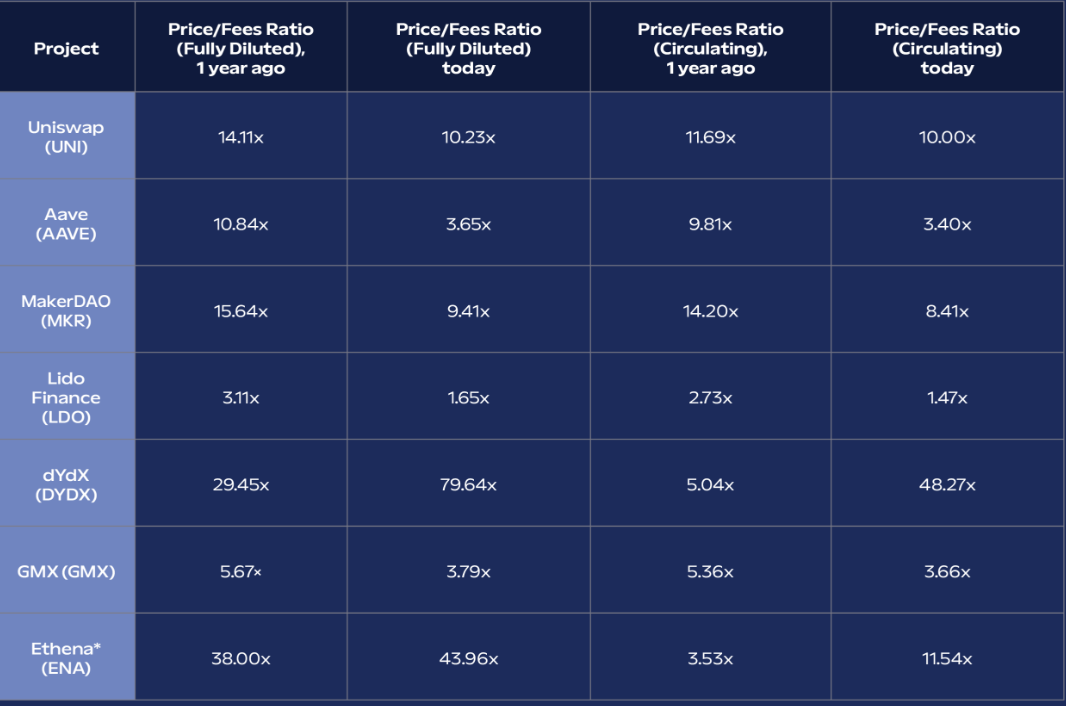 希望将资本部署到超越 ETH 的加密资产的基金,可能会购买那些经过时间考验的产品和相对价值较高的成熟 DeFi 应用,而不是那些流通量较低、完全稀释估值(FDV)较高的新协议。在价格/费用比率(市场愿意为每 $1 的费用支付的倍数)方面,许多 DeFi 协议的定价相较于一年前 ETH 交易约 $1,850 时显著折扣。尽管费用可能受到资产价格的影响,但更广泛的信息是,这些具有经过验证的产品市场契合度的协议在今天的更有利环境中交易的折扣显著。考虑到机构投资者份额增加的更广泛背景,这似乎是一个有吸引力的投资机会。