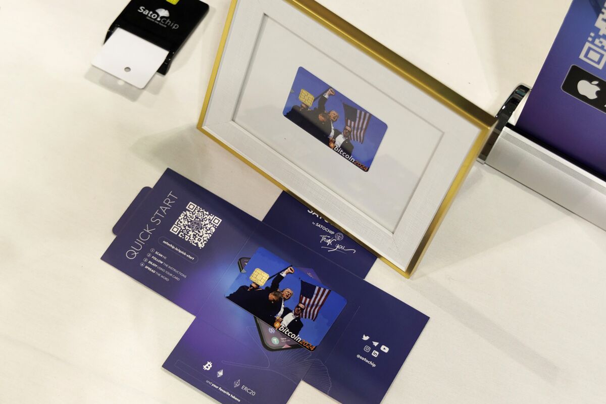 比特币 2024 大会上展示的 Satochip 加密钱包,其中有特朗普遇刺后拍摄的照片。摄影师:Brett Carlsen/Bloomberg