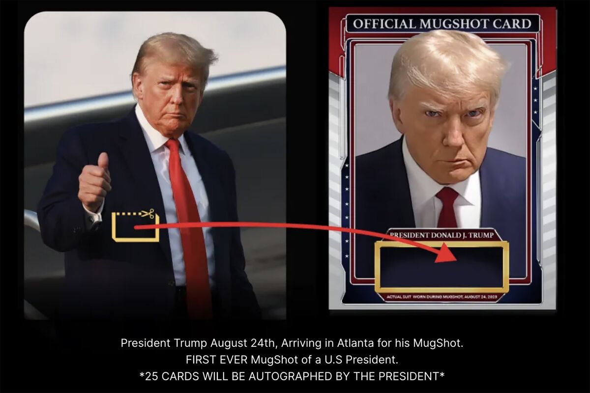特朗普交易卡网站宣传了 NFT 购买的现实世界福利,包括一张实体交易卡,上面有他在 2023 年 8 月 24 日于佐治亚州富尔顿县被捕时所穿西装的碎片。来源:collecttrumpcards.com