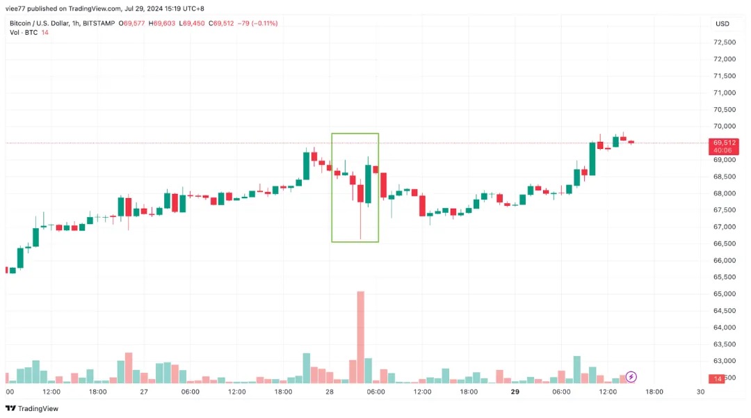 在特朗普讲话期间,比特币上演 V 型走势,先是短线下挫,失守 6.7 万美元;到了演讲结尾时,当他宣布将比特币列为战略储备资产时,比特币直线拉升, 收复了全部跌幅,甚至突破了 69000 美元。