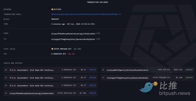 Arkham Intelligence 的区块链数据显示,一个标记为「美国政府:丝绸之路司法部」的钱包将 29,800 BTC 转移到一个没有标记且之前没有交易历史的地址。随后,该地址又将 19,800 BTC 和 10,000 BTC 转发到两个不同的地址。