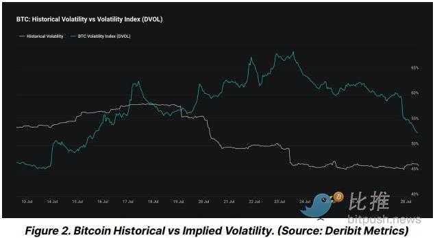 Bitfinex 表示:「我们认为,随着市场消化以太坊 ETF 的推出和纳什维尔会议等短期催化剂,期权市场的这种活动是由短期看涨期权和看跌期权的一些风险降低所驱动的。另一个关键影响因素是 8 月 2 日的月度到期日,尽管该合约的净未平仓合约名义价值约为 22 亿美元,但随着到期日的临近,其时间价值会降低,因此通常会导致隐含波动率下降。」