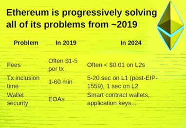 接着 Vitalik 比较了链上交互相关的问题改进,在 2019 年,使用主网的费用比较大,且 ZK-SNARK 的花费更大,现在的交易成本通常小于一美分。以太坊过去十年通过扩容大幅度减少了相关费用并提高了交易处理速度。确认时间(Tx inclusion 时间)方面,2019 年通常需要等到 1 到 5 分钟,如果运气不好,可能需要等待高达 60 分钟才能纳入交易。而现在,在 EIP-1559 实现之后这一过程提高到 5~20 秒,并在 Layer2 上实现了秒级确认。
