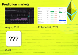 Vitalik 表示,过去 10 年内区块链的相关用例变化不大,集中于稳定币、金融衍生品、去中心化交易所和预测市场等,所以需要讨论未来用例。他在 2014 年谈到了去中心化交易所和预测市场(现在热门预测市场 Polymarket 上成本相较之前降低了很多),不过没有预测到 NFT 的火热。