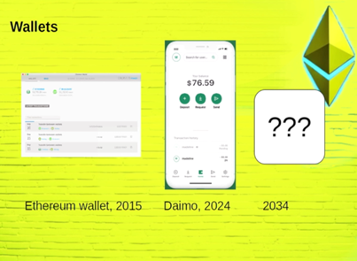钱包方面,以钱包 UI 为例,以太坊 2015 年的钱包界面与比特币高度同质化,2024 年钱包则更偏向传统应用的使用体验。Vitalik 认为二者都不是未来钱包的范式,因为以太坊致力于创造一种新型的基于链上的社会制度。