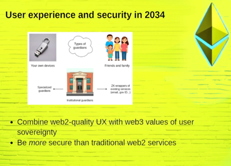 用户体验方面,Vitalik 希望在未来的钱包构建中可以在结合传统用户体验的基础上,集成更多的自我主权和安全性。例如在加密钱包托管上,采用链上链下结合的模式,「守护人」模式可以为钱包增强保护。在用户体验和安全的双重维度方面,2034 年 Web2 用户体验和 Web3 用户主权价值会结合起来,相比传统 Web2 服务更加安全。此外,使用以太坊 L2 将变得如同直接使用以太坊主网一般顺畅无阻。