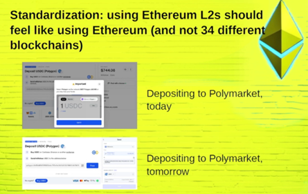 另外 Vitalik 还提出了在交互前端上的标准化体验:通过前端的相关展示(ERC-3770 和 ERC-7683 等),整合 EVM 架构内的多链体验,这里 Vitalik 以预测市场 Polymarket 作为例子,原先用户被提示需要注意链不同所带来的误转风险,未来可以直接通过单一前端进行无缝交互。
