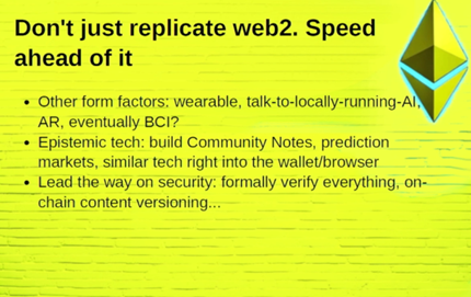 另外,Vitalik 认为构建者不应该只是复制 Web2,而是要先行一步,勇于探索。2034 年不会只有桌面和移动设备,还会有可穿戴设备、可本地运行的 AI、AR,最终可能是 BCI,也会有一些将 Community Notes、预测市场和类似技术直接内置到钱包或浏览器中的实用技术,安全性方面也能够验证一切或提供链上内容版本证明等。这些构建也产生了加密货币的意义,即在持续的安全挑战中从源头上保护人们。