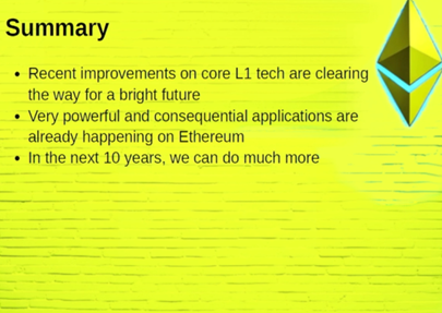 最后,Vitalik 做了对应总结,他表示过去十年以太坊的发展专注于理论上,现在当开发者们可以达到用户所需要的体验质量时,足够强大和足够重要的应用便已在以太坊上构建,这时便可以将注意力转向如何构建对世界产生影响的应用,同时保留所有人拥有的价值。