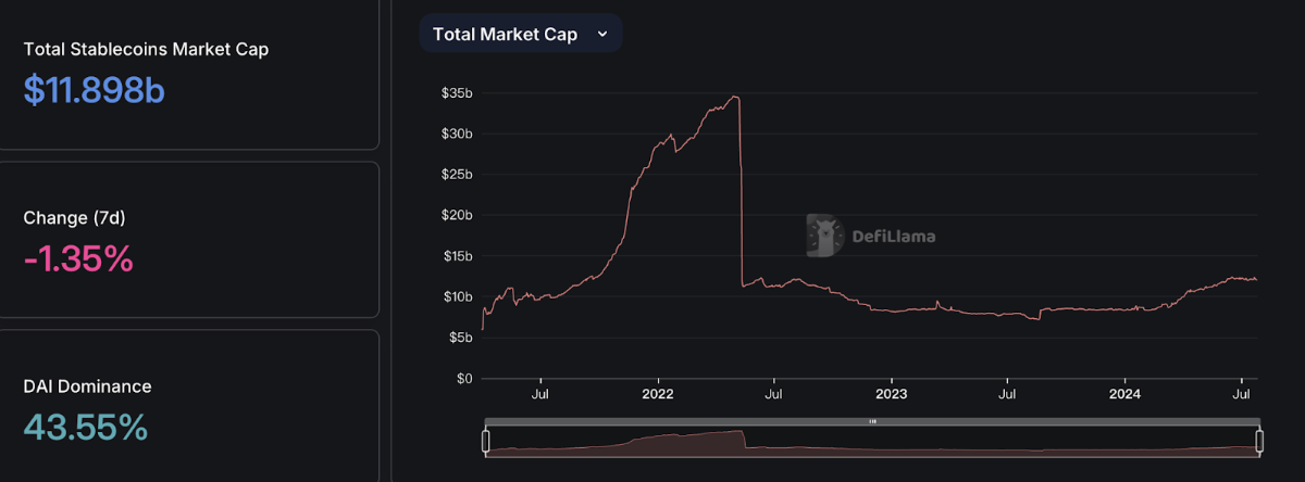 当前市面上去中心化稳定币种类超 100 个,总市值为 118.9 亿美元,尚未回到上一轮牛市的 300 亿美元水平。其中,MakerDAO 的 DAI 以 43.55% 占主导地位,市值为 51.81 亿美元。