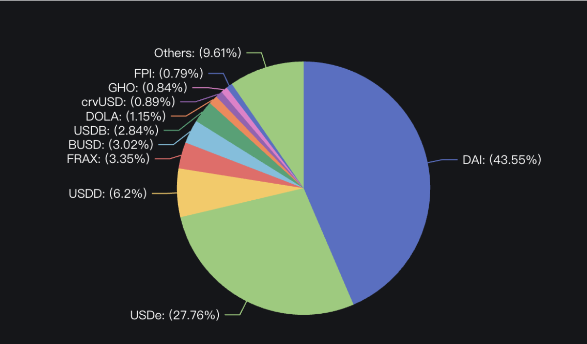 今年以来,Ethena 的 USDe 表现最佳,市值已突破 33 亿美元,成为第二大去中心化稳定币,其它去中心化稳定币市值均未超过 10 亿美元。