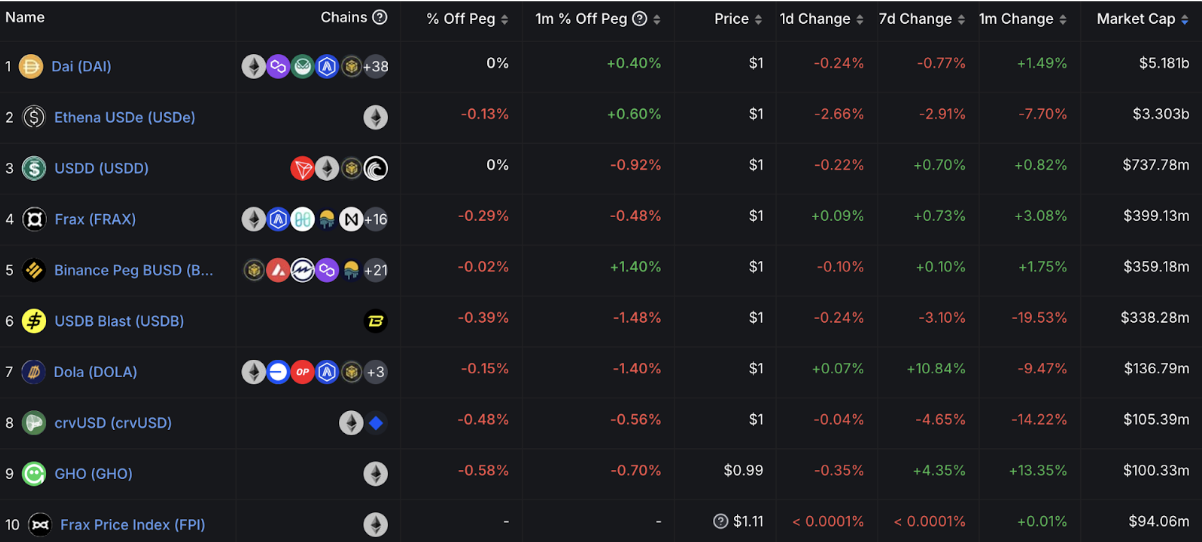 值得注意的是,在市值前十的去中心化稳定币中,排名第二的 USDe 的 33 亿美元市值均在以太坊主网上,而排名第六的 USDY 有 3.38 亿美元市值均在 Blast 上。其他头部协议均以多链为主。