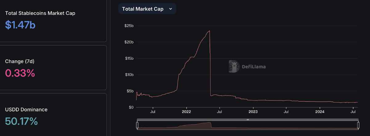 算法稳定币的市值为 14.7 亿美元,占整个去中心化稳定币市值的 12.35%。但自 Luna 暴雷后算稳一蹶不振,整体仍在呈下行趋势。目前比较知名的项目包括孙宇晨推出的 USDD(市值 7.37 亿美元)、FRAX,其他算稳市值均未超过 1 亿美元。