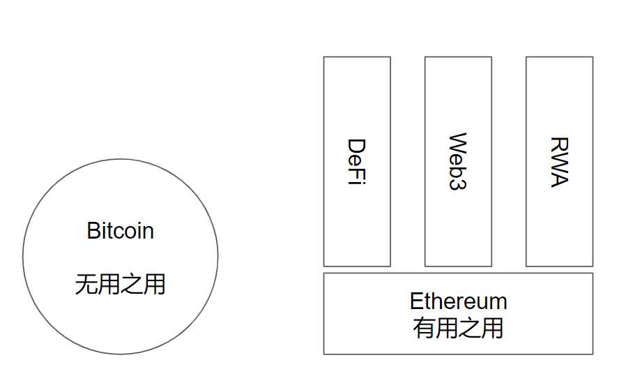 比特币跟以太坊提供了不同的承诺,比特币是站稳数字黄金的位置,不断提高市值。而以太坊是打下基础,为 DeFi、Web3、RWA 等应用提供支撑。