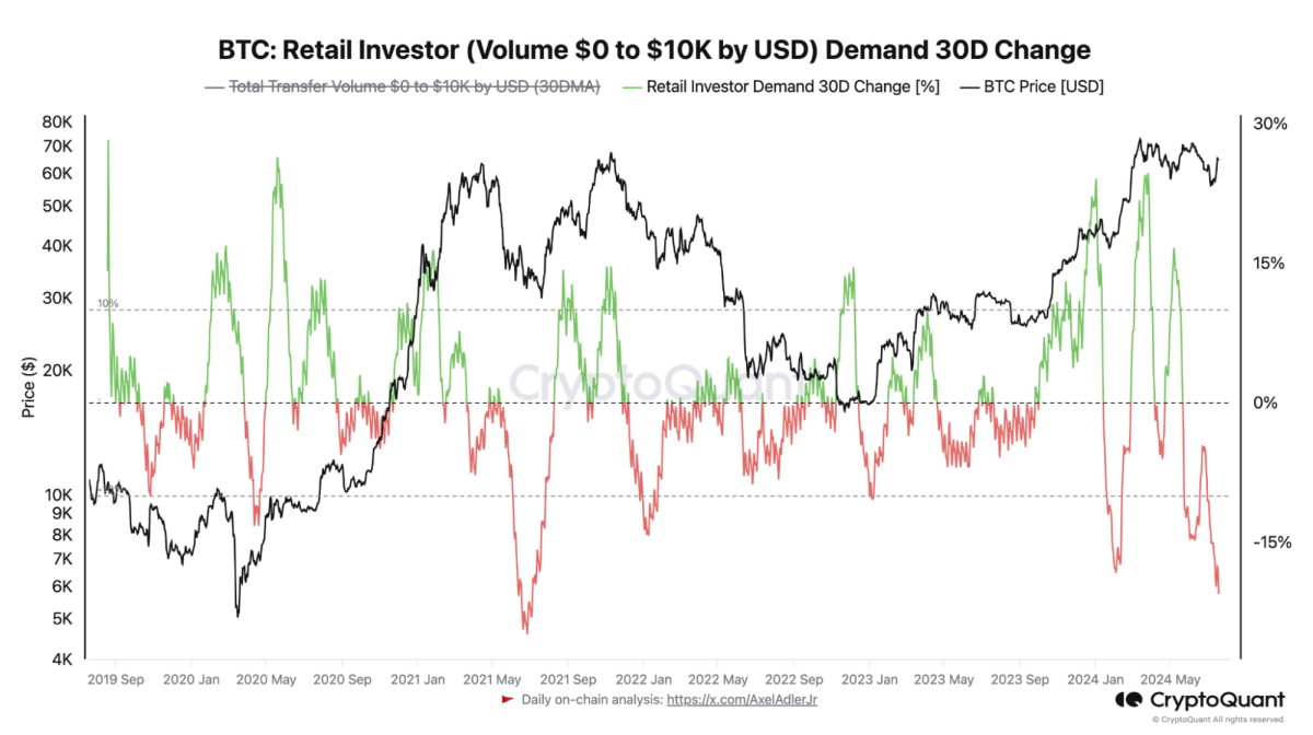尽管比特币距离 ATH 不足 10%,但如下图所示,以总交易量在 1 万美元以下的 30 天总转账量变化衡量的散户流量处于 3 年来的最低点。