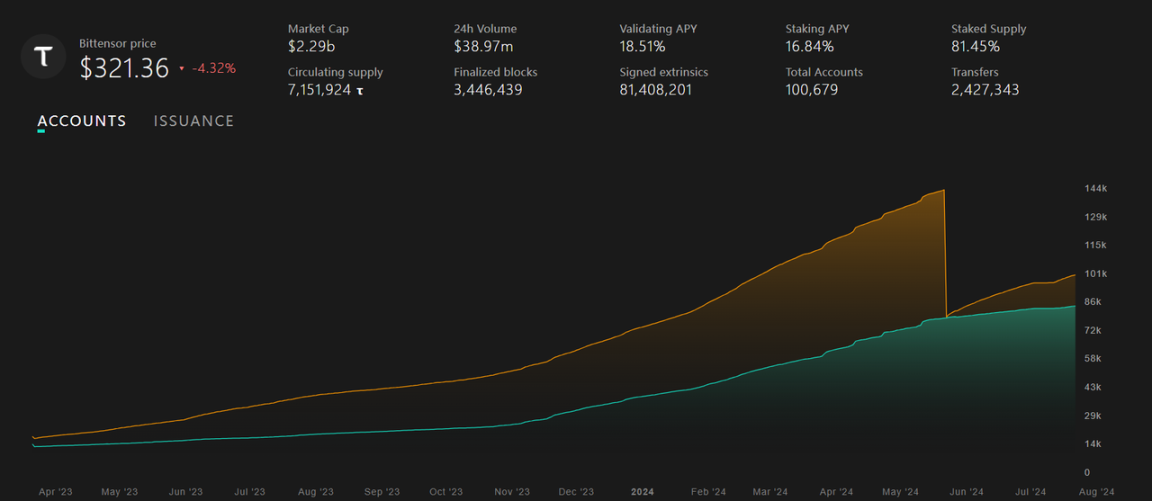 Bittensor 网络账户总数量目前高达 10 万 +,其中非零账户数多达 8 万。