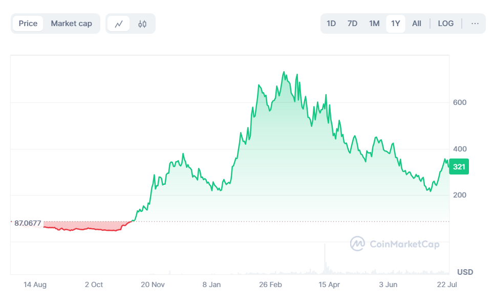 在过去的一年中,TAO 最高上涨数十倍,目前市值 22.78 亿美元,币价 321 美元。