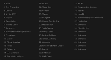 截止至撰稿时间,Bittensor 子网注册数量达到 45 个,已命名数量为 40 个。在过去子网限定数量时,子网注册竞争非常激烈,注册价曾一度高达百万美元。目前 Bittensor 逐步开放更多的子网注册名额,新注册的子网在稳定性、模型功效等方面可能不及运行时间较长的子网。但是由于 Bittensor 引入的子网淘汰机制,在长期来看,是一个良币淘汰劣币的过程,模型性能较差、实力不足的子网将难以生存。