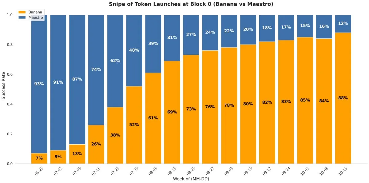 Banana Gun 的这一策略非常有效,以至于在 2023 年 6 月到 10 月期间,与行业领先的 TG Bot “Maestro”(自 2022 年中期运营)相比,Banana Gun 用户的“区块 0”主导地位从 7% 上升到在 TG Bot 领域赢得了 88% 的第一批捆绑包。