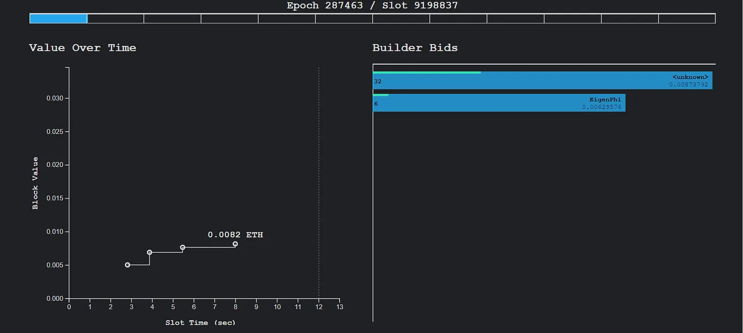 通常情况下,在一个健康竞争的基于提议者分配(PBS)的区块构建市场中,由 TG Bot 发起的交易会被分配给各种构建者,这些构建者会从交易内存池中获取待处理的交易,优化它们以最大化价值,构建区块并竞标给提议者,以确保他们自己的区块被包含在内。在区块的 12 秒生命周期内,这一交易过程的实时可视化可以在 Payload 上看到。