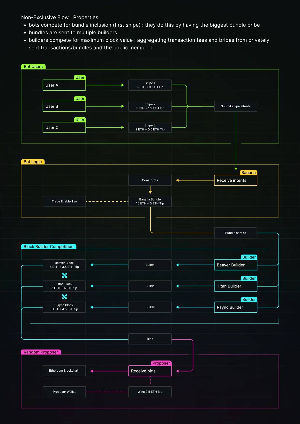 首先,TG Bot 为用户提供的不仅仅是狙击服务,还有普通的买卖交易,包括链上的限价单。然而,Banana 的商业模式主要根植于其“狙击”叙事。其高额的区块 0 贿赂文化推动了其强劲的收入流。因此,Banana 的商业模式是基于向用户保证,他们将在任何竞争对手之前进入代币交易。通常,为了最大化区块 0 贿赂捆绑在链上成功的机会,这样的发起者会将其用户的捆绑发送给以太坊上的所有领先构建者。