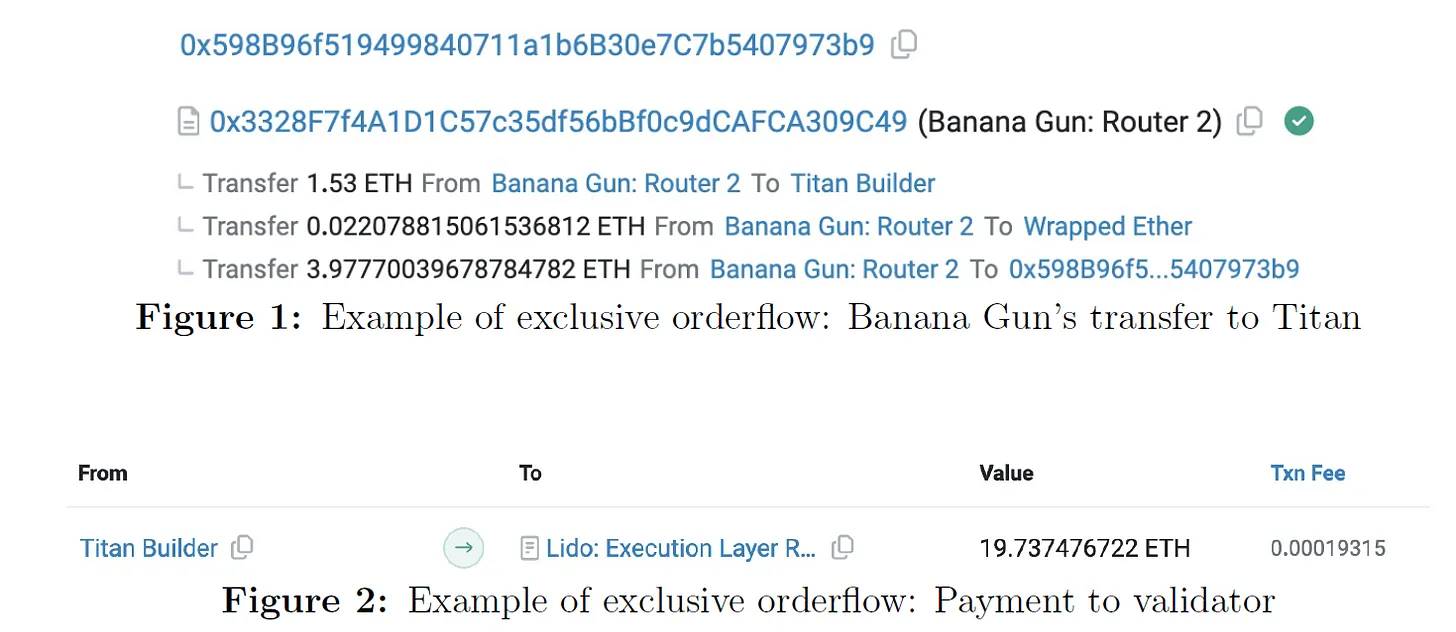 这篇论文支持了我在回顾 2023 年 12 月至 2024 年 3 月之间以太坊链上超过 3500 个区块时的初步计算,其中 Banana 区块 0 捆绑几乎专门通过 Titan Builder 路由。这表明,在 Banana 用户为将他们的狙击交易上链支付的总额 4466.89 ETH 中,仅有 2915.65 ETH 被转移给以太坊提案者,而 2271.26 ETH 被 Titan Builder 独占。即便假设 Banana 和 Titan 之间的私人 EOF 按 50-50 分配,也可以推测在此期间有 1135.63 ETH 被送回 Banana Gun 团队的私人账户。这些将是未申报的利润,金额高达数百万美元,来自那些被 Banana Gun 团队引导进入高贿赂文化的无辜用户。