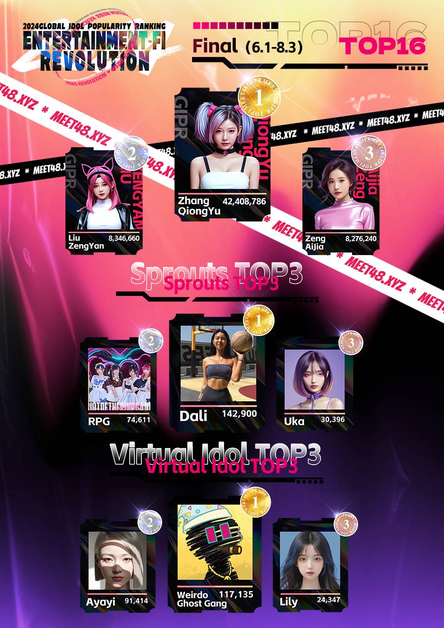 8月3日,基于AI和WEB3.0多样化UGC娱乐内容生态的元宇宙虚拟社区MEET48的”2024 GIPR2“投票活动正式落下帷幕,公布了偶像组、素人组以及虚拟人组的top参赛者排名和出席后续多个由MEET48主办或合作的全球大型Web3活动的推广计划。MEET48投票活动Dapp的链上数据和在DappBay和DappRadar上的排名表现出色,引起了广泛关注。