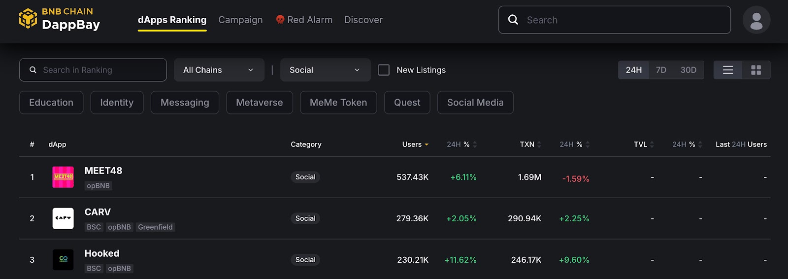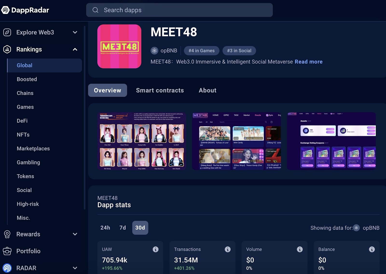 截至8月3日,MEET48的活动Dapp已经成为DappBay社交类排名第一名,并在DappRadar社交类Dapp排名中位列第三名。根据DappRadar的数据显示,MEET48的活动Dapp在过去30天内的链上Transacions达到了31.54M,活跃用户地址数UAW达到了705.94K。而在DappBay的统计中,MEET48的活动Dapp同样表现优异,在过去30天内的链上Transacions达到了32.61M,活跃用户地址数UAW达到了701.68k。