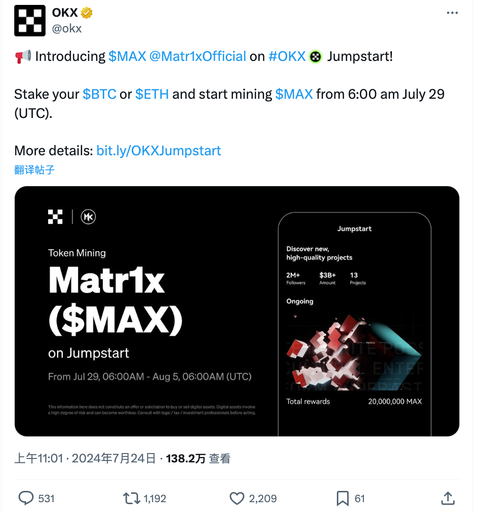 而从 CEX 的上币动向中,我们也能看到这种机会的蛛丝马迹 --- 7月29日,OKX 的 Jumpstart 上线了游戏类项目 Matr1x 的代币 $MAX,8月5日则会在 OKX 和 BingX 等多家 CEX 开启交易。