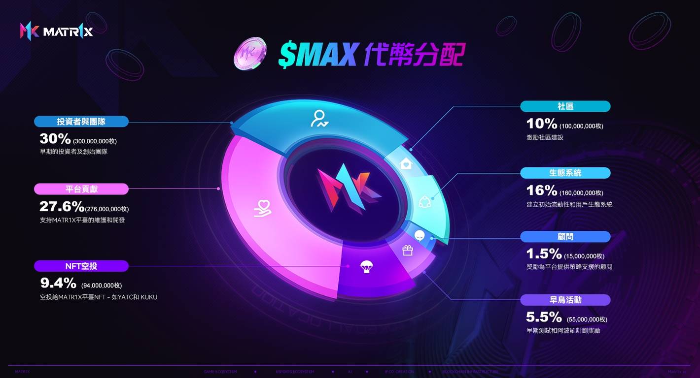 作为 Matr1x 整个平台的治理代币,$MAX 没有公开募资,也没有Private sale,总供应量为 10 亿枚,旨在支持生态系统内的应用和服务。