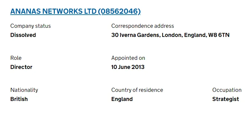 根据gov.uk显示,Emad从30岁开始,在他的豪宅中开启了6段创业,其第一家公司名为ANANAS网络公司,这家公司对外被宣传为一个致力于促进人工智能用于社会公益的非营利组织。
