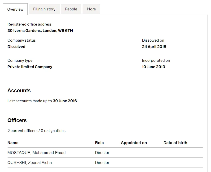这家公司的职员只有Emad和他的小姨子Aisha Qureshi (1991年出生),5年后倒闭。