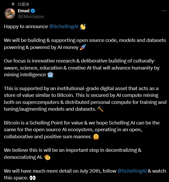 由于自己做项目是非常有成就感的,Emad在离职2个多月后,发布了自己的Web3+AI项目:SchellingAI。