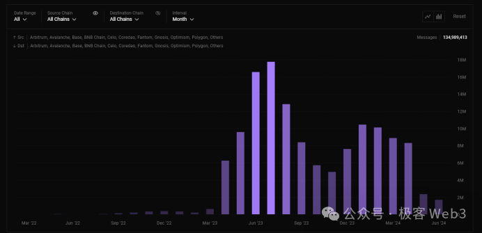 这种现象的一个典型例子就是 LayerZero,在空投之后用户的使用率急剧下降(如下图所示)。可以说,当今空投赛道所谓的怪象与变化,似乎也正是在回归本源,即不再让那些没有真正为生态系统做出贡献的用户获得收益。