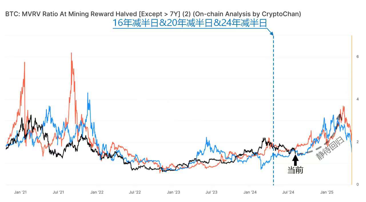 图一:MVRV (Market Value to Realized Value) 指 BTC 市价跟链上 BTC 总体买入均价之比。图中 MVRV 把链上超过 7 年没动过的 BTC 视作长期休眠或丢失从计算中剔除。图中黑线为 BTC: MVRV 指标的【22 年 - 至今】段;蓝线为 BTC: MVRV 指标的【18-21 年】段;红线为 BTC: MVRV 指标的【14-17 年】段。三段线将各自周期的 BTC 挖矿产量减半日对齐。
