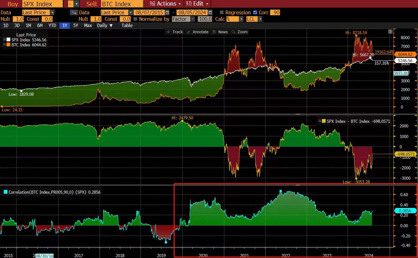 全球市场动荡的背景下,「3·12」的惨烈似乎再次显现。市场一线的机构和分析师预期到 2024 年底美联储降息两次更加合理市场对利率下降和对经济衰退的担忧迫在眉睫,而比特币价格暴跌常常与纳斯达克 100 指数的下跌几乎同步发生,部分已减仓但并未退出加密市场,长期仍看涨关注技术、行业和采用。