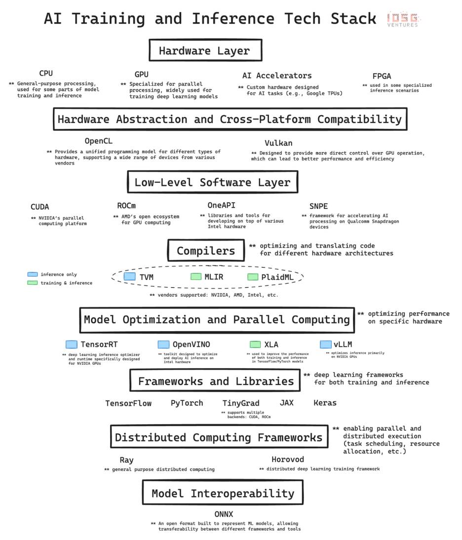 AI 技术栈中的这一层至关重要,因为它构建了高级 AI 框架与底层硬件之间的桥梁。CUDA、ROCm、OneAPI 和 SNPE 等技术加强了高级框架与特定硬件架构之间的联系,实现了性能的优化。