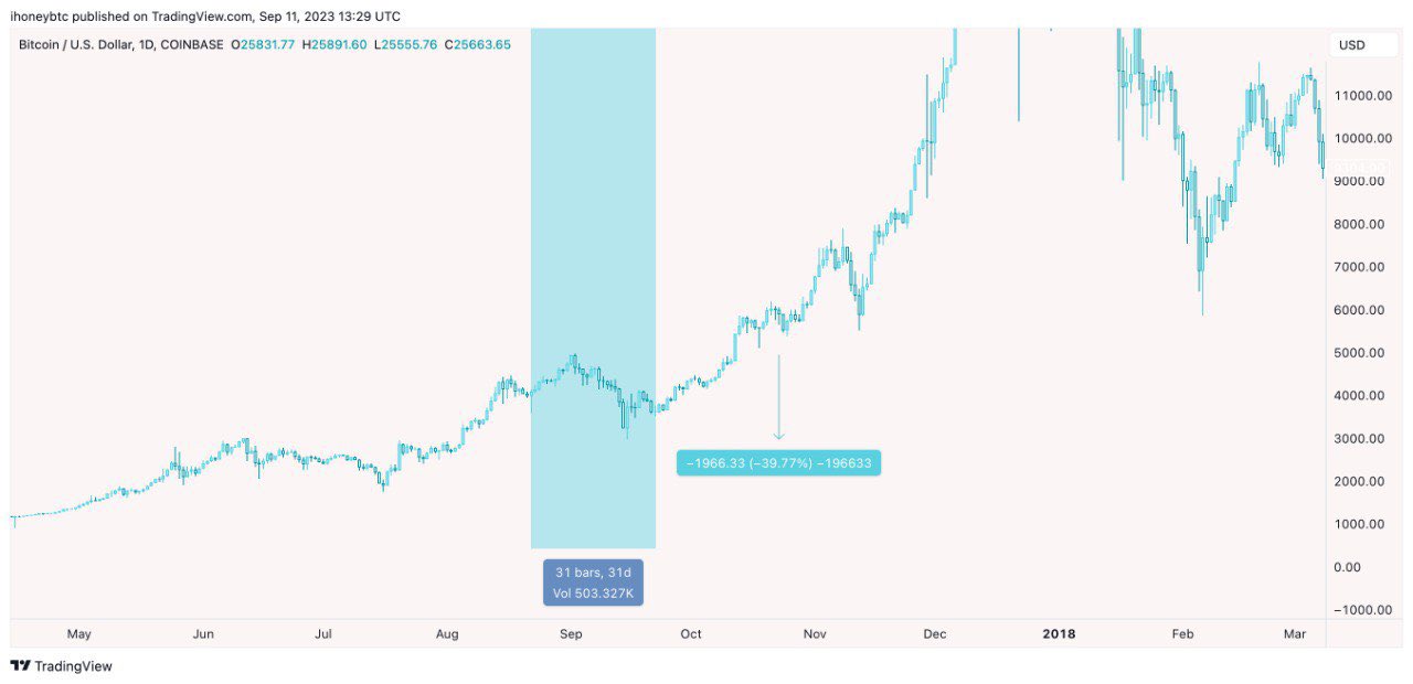 在 2017 年,鬼月从 8 月 22 日开始,至 9 月 19 日结束。在此期间,比特币的价格从高点的近 5,000 美元暴跌至 3,000 美元附近,跌幅近 40% 。