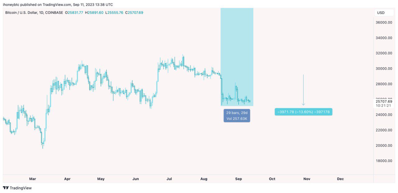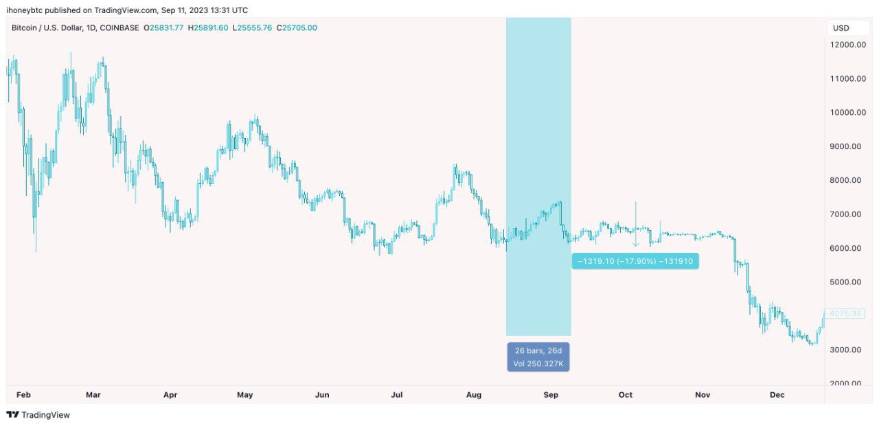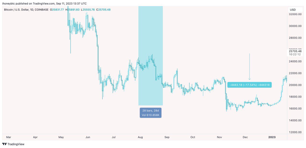 这一年,也就是 2023 年,鬼月于 8 月 16 日开始,而有趣的是,紧接着的第二天,比特币价格就从高点的近 29,000 美元暴跌至近 25,000 美元。如果我们仔细分析,比特币在当月已经下跌了约 15%。